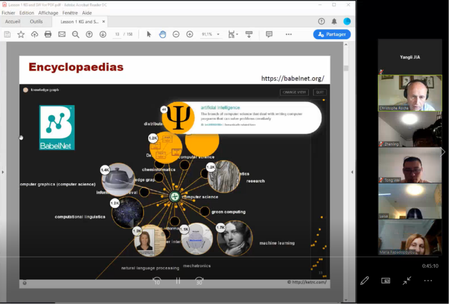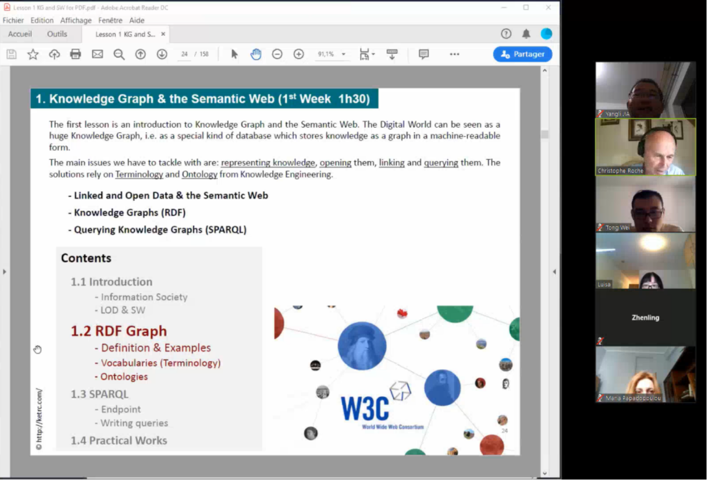 为落实学校党委关于做好疫情防控期间“停课不停教、停课不停学、停课不停研”的部署,4月23日至6月11日,计算机学院利用Zoom会议系统开展了6场线上学术报告和国际交流活动。 线上系列学术报告与交流围绕“数字人文时代的本体与术语学”展开,包括了“Knowledge Graph & the Semantic Web”、“Terminology”、“Ontology”、“Digital Humanities”、“Smart City”五个专题,由我校外知识工程与术语学中法联合研究中心主任Christophe Roche教授主讲。希腊学者Maria Papadoupulou教授、中国人民大学安小米教授、山东省标准化研究院高永超研究员、维也纳大学刘翚博士,以及多位ISO TC37委员会国际标准制定专家、 IEC智慧城市国际标准制定专家、我校知识工程与术语学中法联合研究中心成员、计算机学院部分教师与研究生等30余人参与了这一系列交流活动。 通过此次线上学术交流活动,与会专家对知识图谱、语义Web、计算术语学、数字人文和智慧城市标准等内容进行了深入交流,达成了下一步合作意向。同时,本系列活动的成功开展也拓宽了学术研究讨论的渠道,丰富了学术活动与国际交流的形式,开阔了师生学术视野。