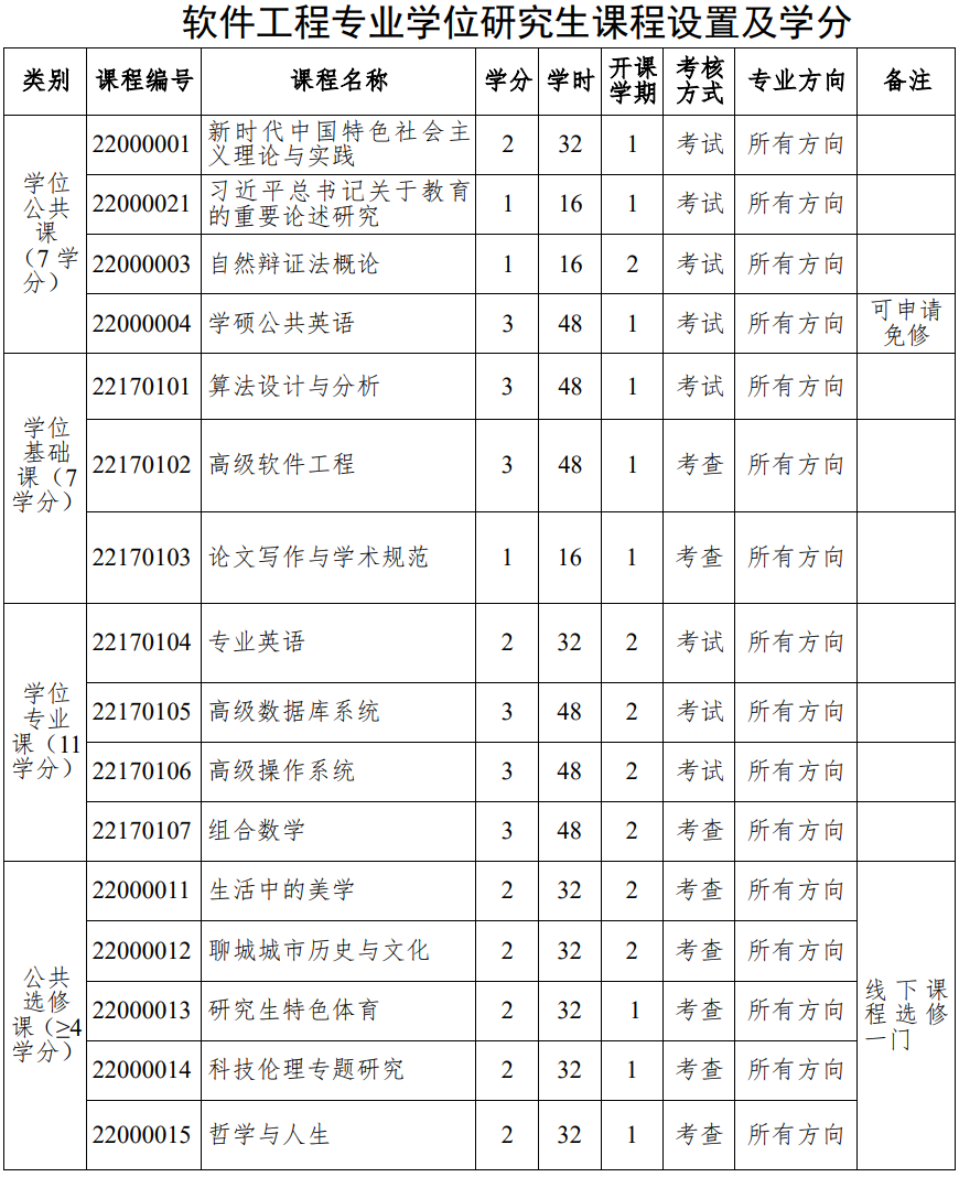 软件工程学术学位研究生应修总学分不少于 38 学分,其中学位必修学分不少于25 学分、公共选修学分不少于 4 学分、培养环节必修学分不少于 3 学分。