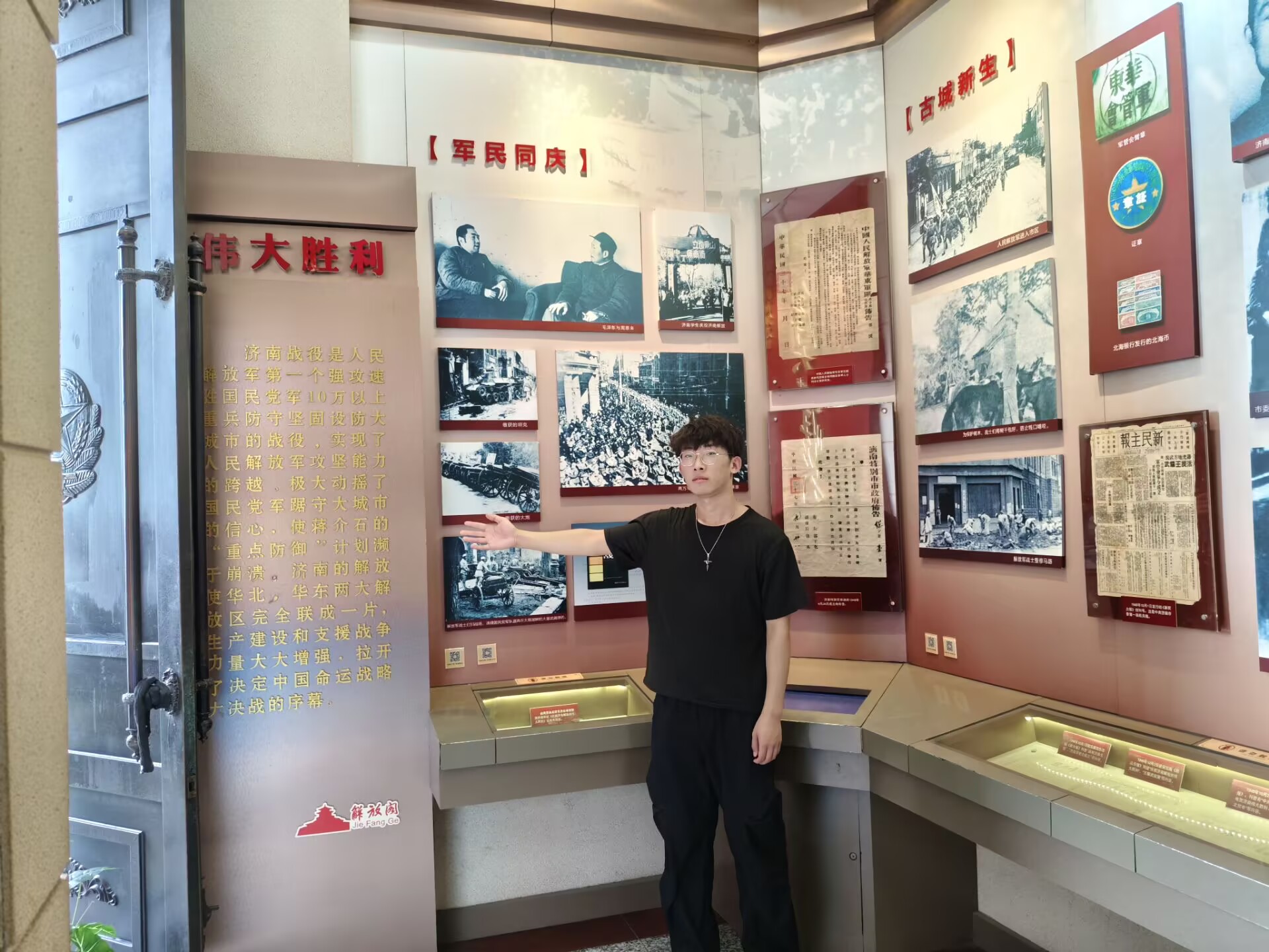 活动伊始,同学们在讲解员的带领下,有序进入解放阁。通过聆听讲解,大家深入了解济南战役的光辉历史,从战役的筹备、激烈战斗过程,到最终济南获得解放,每一个故事都让同学们感受到革命先辈们为了胜利英勇无畏、舍生忘死的精神。在解放阁内,珍贵的历史照片、详实的文献资料以及战役相关的实物展品,生动再现了那段波澜壮阔的岁月,同学们驻足凝视,不时交流探讨,沉浸在对历史的追思中。随后,同学们登上解放阁,俯瞰周边景色,感受济南这座城市的发展变迁。大家纷纷表示,如今的幸福生活来之不易,是无数革命先烈用热血和生命换来的,要以先辈为榜样,将爱国情、强国志转化为实际行动,在学习和生活中传承红色精神,努力提升自身本领,为国家和社会发展贡献力量。