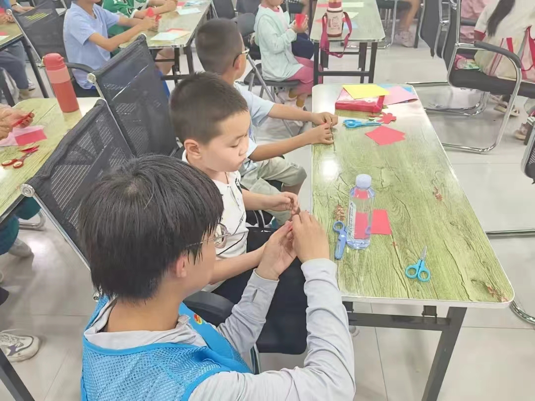 剪纸成形意盈盈,传承非遗永流芳。实践活动前期,团队成员认真备课和研讨,精心构思活动内容,购置剪纸用品。进入活动室之后,成员们介绍了剪纸的历史由来,起源和用途,帮助小朋友们了解手工剪纸的艺术特点和寓意。团队成员一边为小朋友介绍,一边进行操作演示,细心地为小朋友讲解剪纸的技巧,他们还鼓励小朋友们根据自己的想象力和创造力,多进行自主创作,让剪刀在纸上自由地“舞蹈”。大家热情高涨,纷纷在红色的剪纸上描画、折叠、剪开。在剪纸教学中,小朋友们不仅学习到剪纸的基本知识和技巧,他们的动手动脑能力也获得了一定程度的锻炼。此外,我们还可以借此机会向小朋友们普及防溺水知识,提高他们的自我保护意识。让孩子们在快乐剪纸的同时,更深层次地感受到中华文化的魅力和重要性,增强对中华文化的认知和理解。