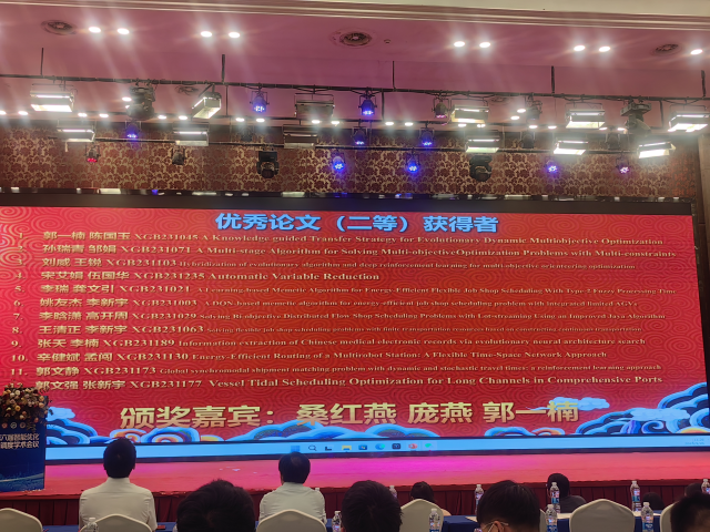近日,我院高开周老师课题组最新研究成果《An Improved Artificial Bee Colony Algorithm with Q-learning for Solving Permutation Flow-shop Scheduling Problems》获得第六届智能优化与调度学术会议优秀论文二等奖。该论文第一作者为我院2020级硕士研究生李晗潇,指导老师为高开周博士。我院桑红燕教授作为颁奖嘉宾之一,为获奖者颁奖。